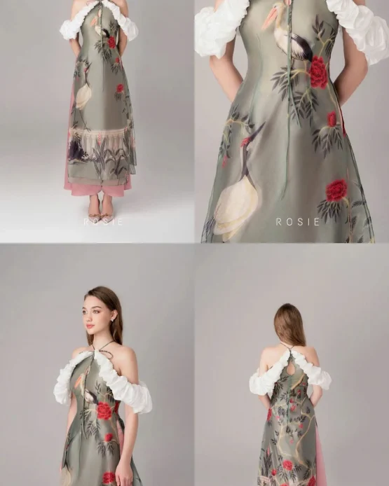 Áo dài cách tân Ding_Dang hồng in hoa tay phồng