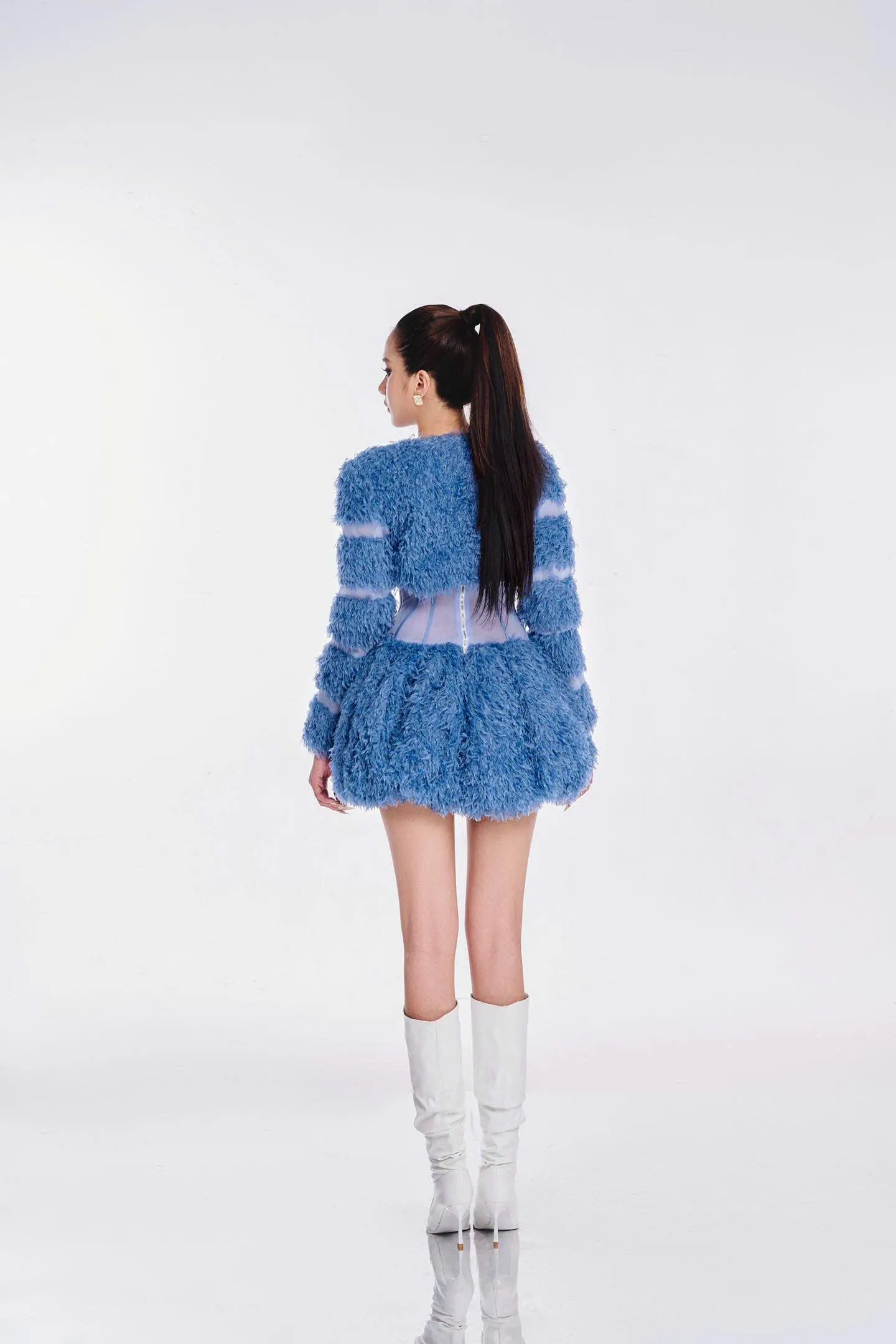 Đầm dự tiệc Linh_Phung màu xanh lam với corset ôm eo và chân váy lông xù độc đáo, tạo phong cách cá tính và nổi bật. Phù hợp dự sự kiện, chụp ảnh.