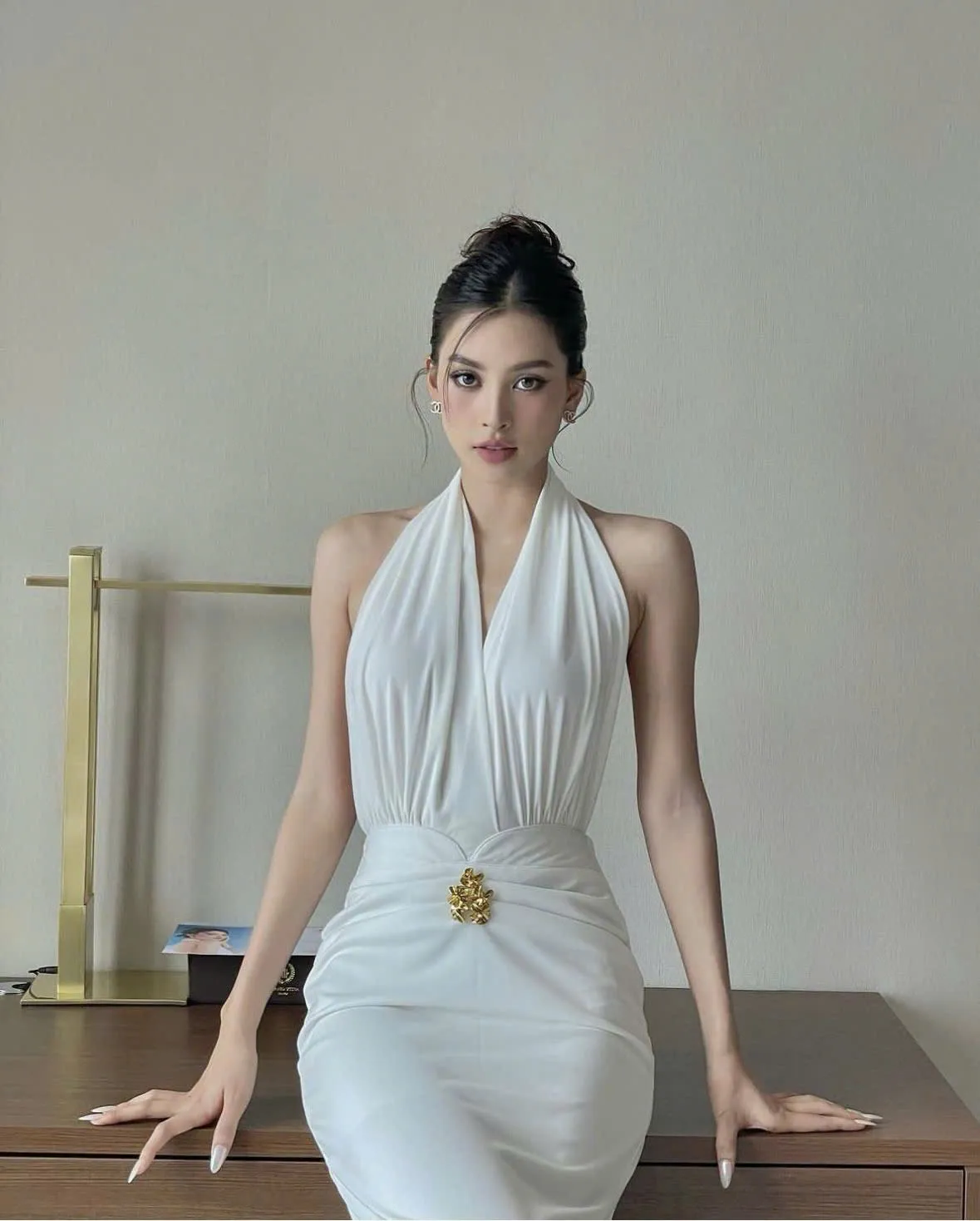 Đầm Sensore trắng tinh khôi với thiết kế cổ yếm, hở lưng quyến rũ, chất lụa mềm mại ôm dáng. Lý tưởng cho dạ tiệc và tiệc cưới.