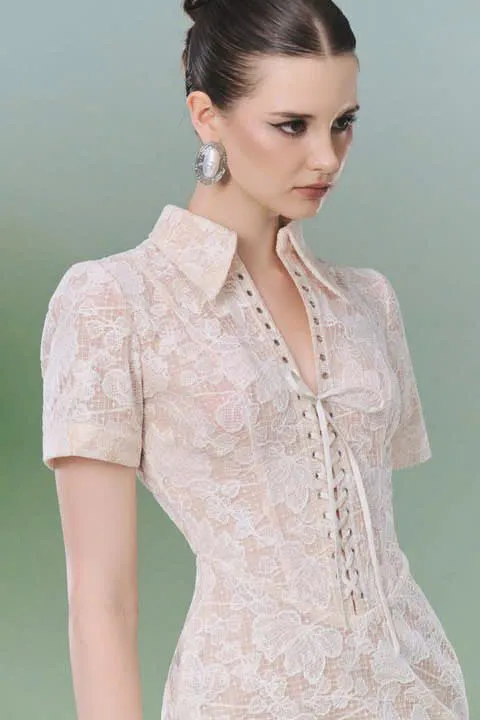 Đầm midi Laling ren màu kem, phom ôm tinh tế, cổ V thắt dây corset độc đáo. Tôn dáng thanh lịch, phù hợp dự sự kiện, tiệc tùng và hẹn hò, giúp bạn tự tin tỏa sáng.