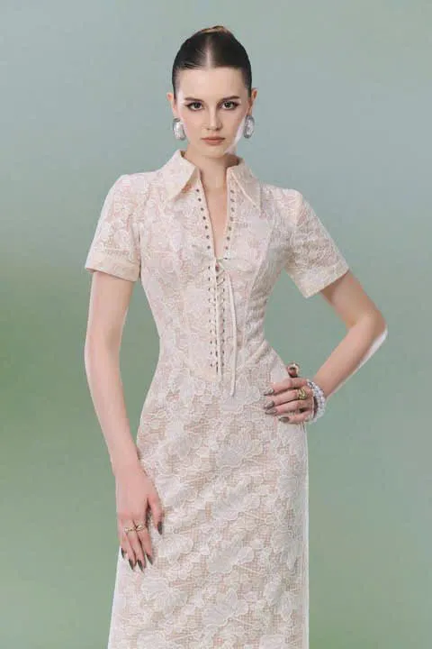 Đầm Midi Laling Ren Phom Ôm Cổ V Thắt Dây Tinh Tế