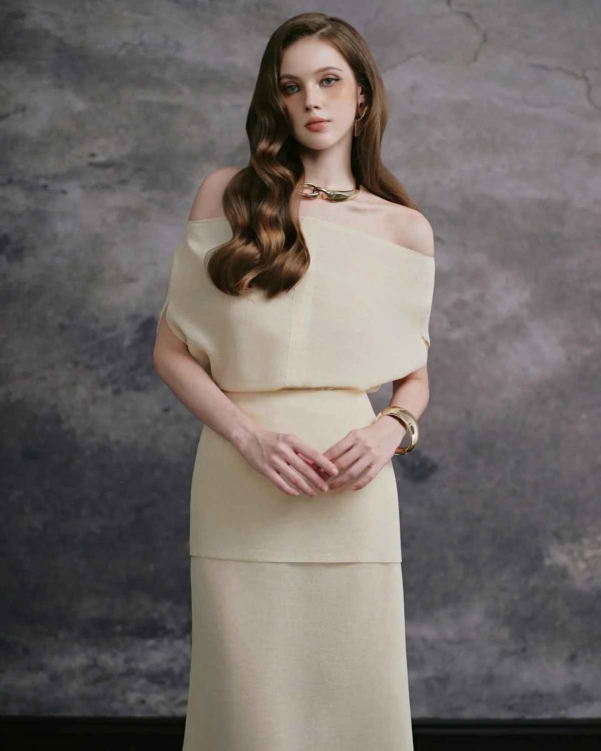 Delicate Size L – Đầm dạ hội trễ vai màu kem thanh lịch